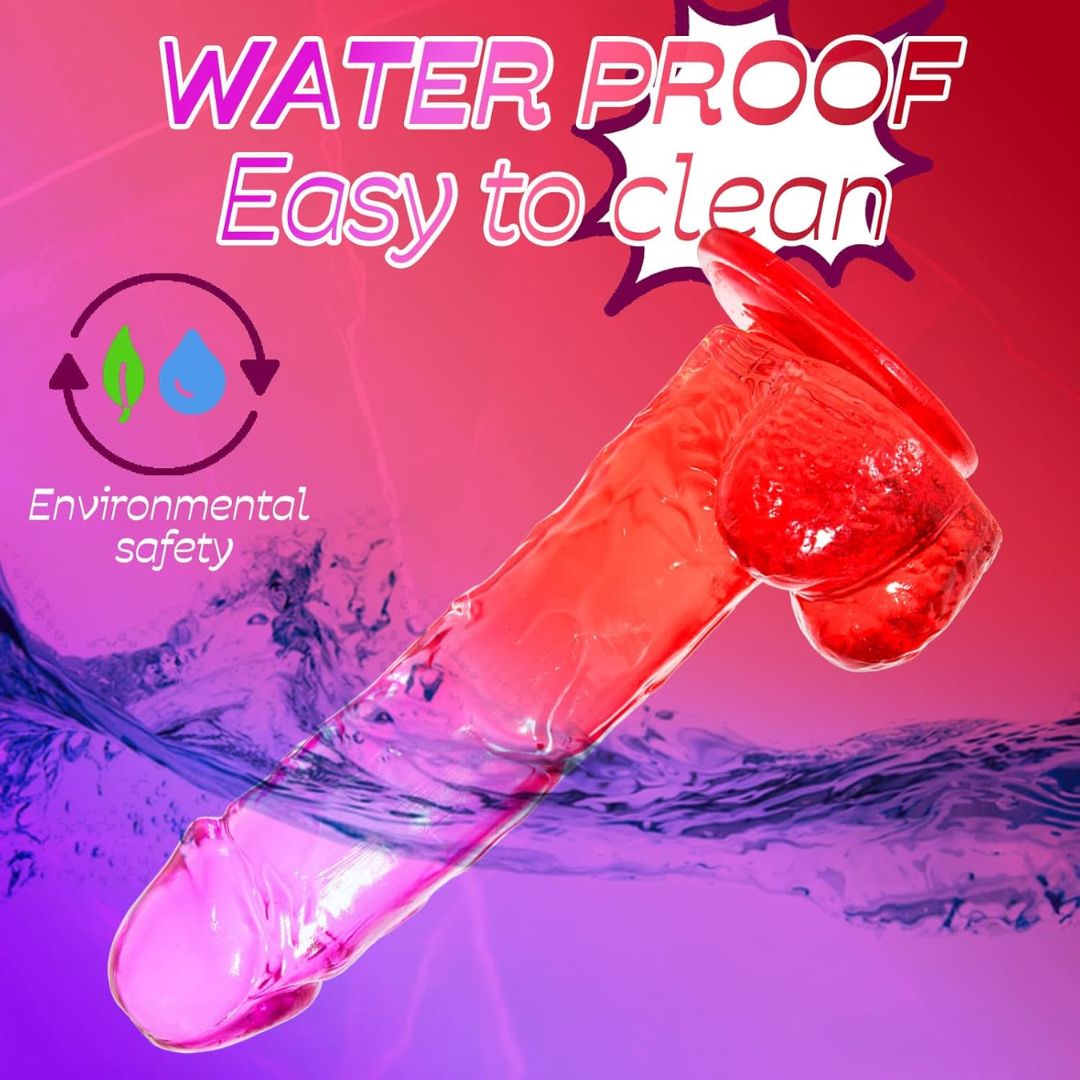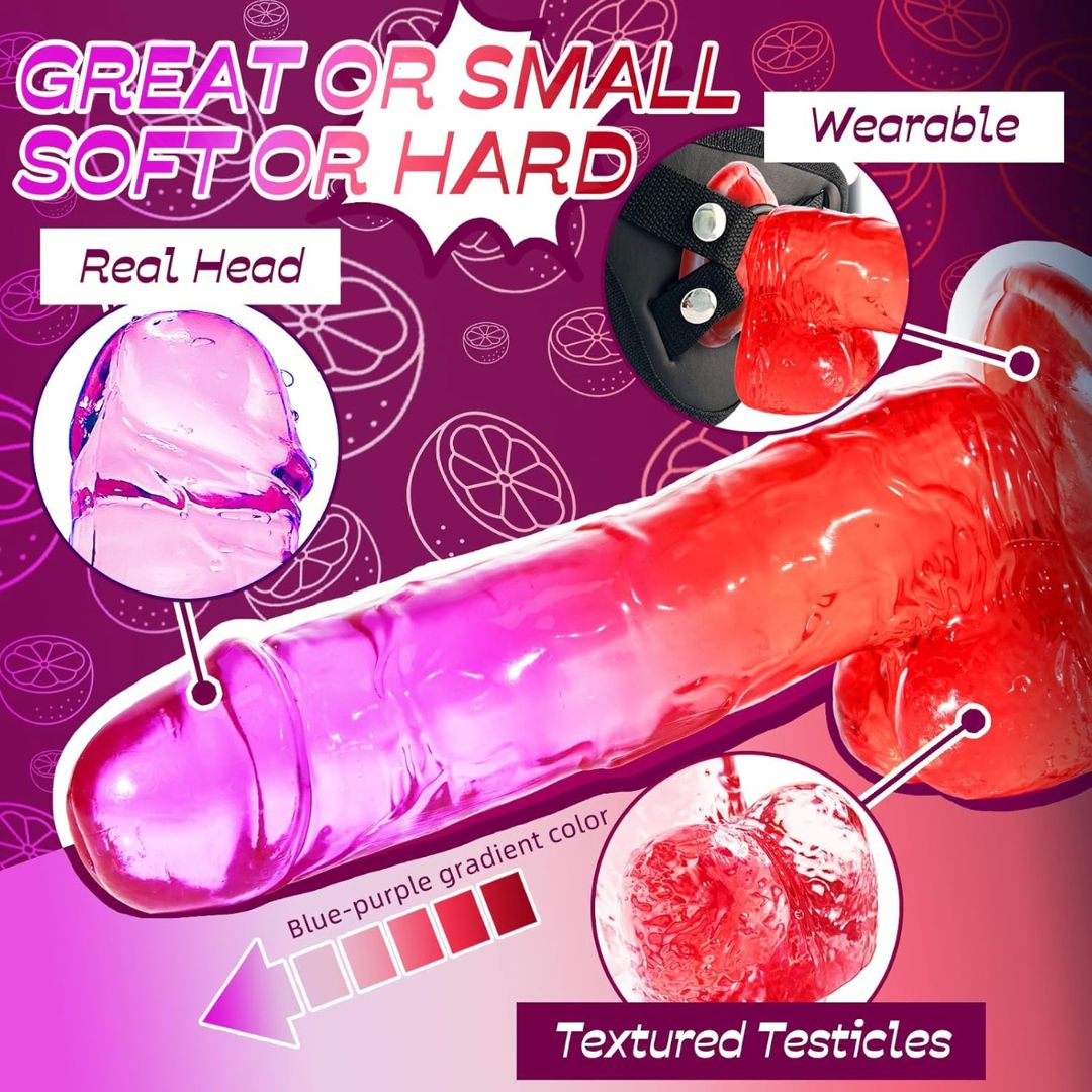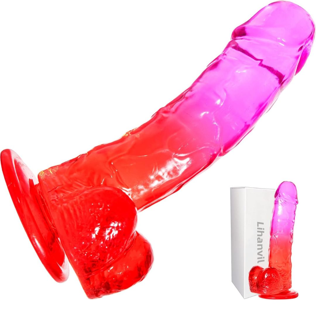 Experience pleasure and comfort with the Realistic 7.8 Inch Clear Silicone Massager in a stunning purple-red gradient design. Crafted from premium, body-safe silicone, this dual-layer toy feels soft and flexible on the outside while maintaining a firm inner core for realistic sensations.